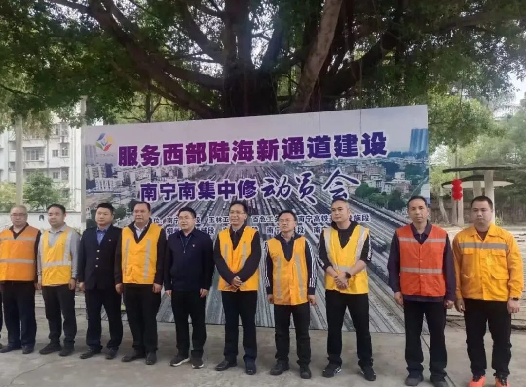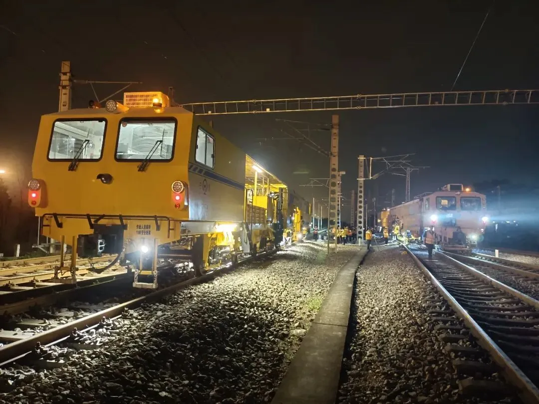 经过数小时的细致整备,大机附挂准备、机具检修、人员调配等各项筹备工作全部闭环落地。伴随着隆隆机鸣,机车驶入检修基地与大机车列稳稳连挂,整装待发的集中修队伍缓缓驶出基地,向着南宁南施工一线全速奔赴。