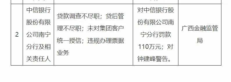 罚单预警!中信银行南宁分行因信贷违规被罚110万,多分支机构乱象凸显