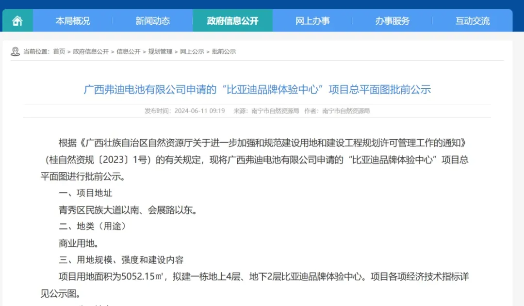 2024年6月,南宁市自然资源局对南宁比亚迪品牌体验中心项目建筑设计方案进行审批,核发工程规划许可证。