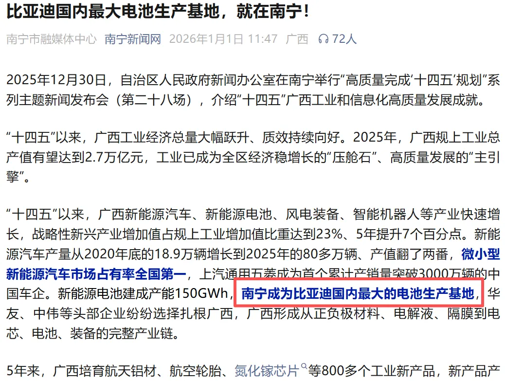 2026年1月,南宁更是强势官宣“比亚迪国内最大电池生产基地,就在南宁”。