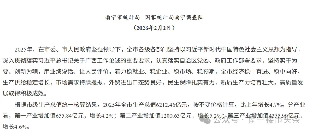 在最新公布的2025年经济数据,南宁全市生产总值6212.46亿元,比上年增长4.7%。