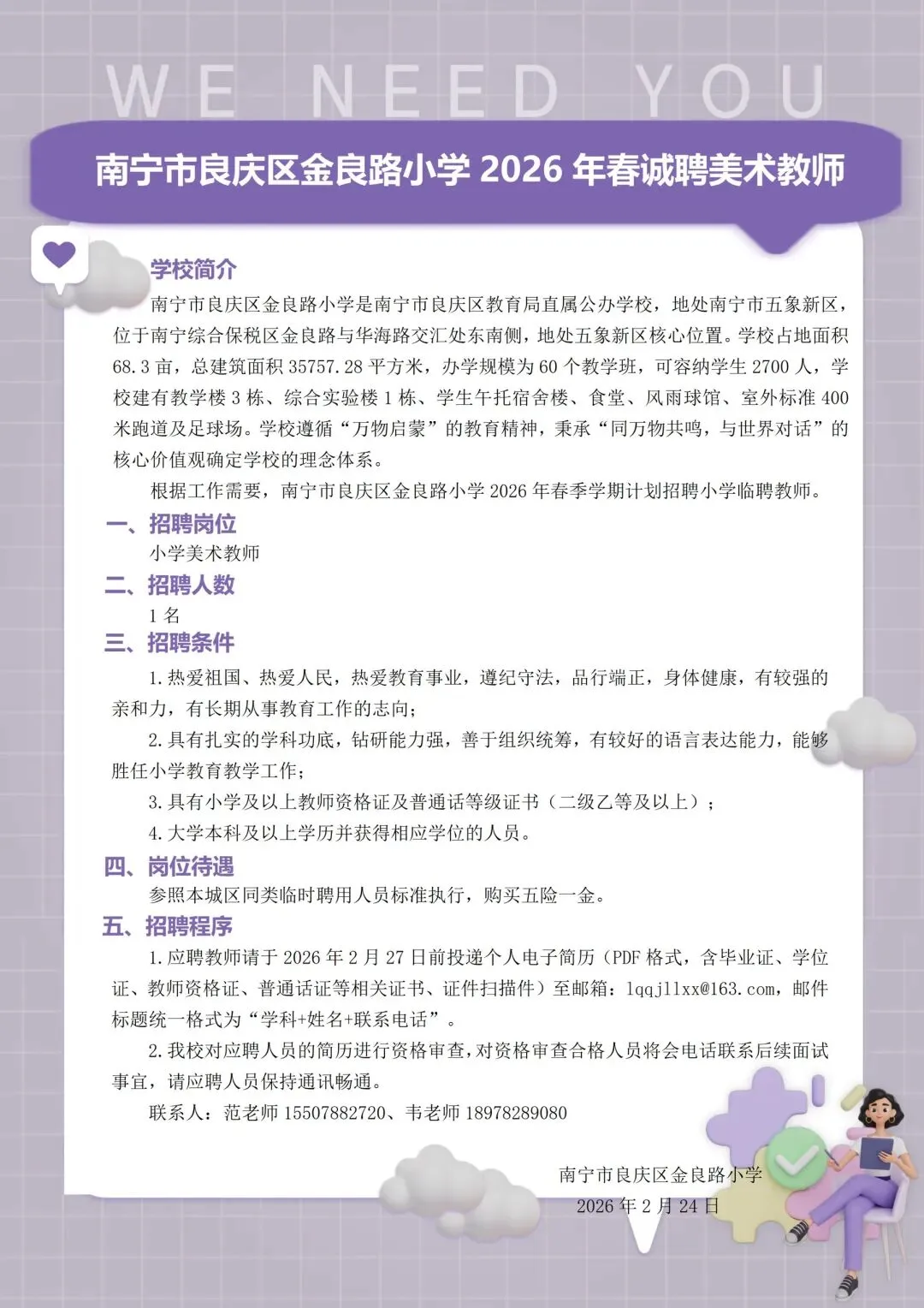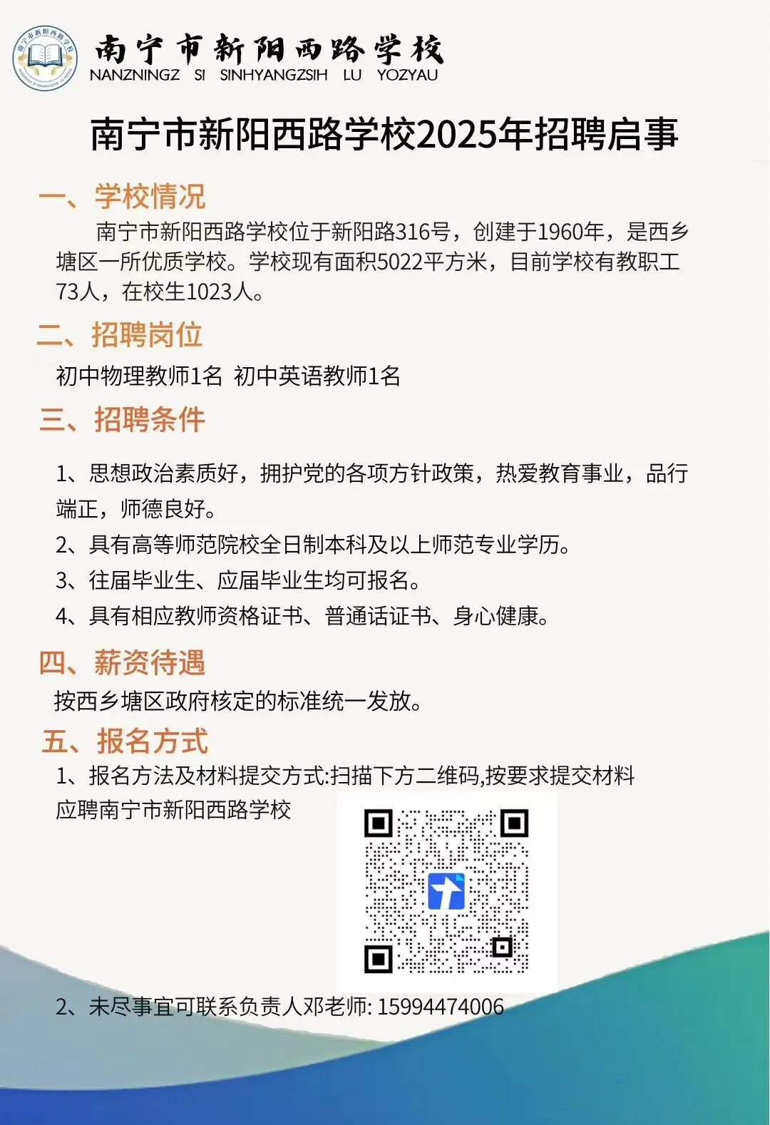南宁市体强路初级中学位于广西体育中心对面,4号线地铁口附近,现诚聘英语教师1名,道德与法治教师1名。要求具有相对应学科专业、本科及以上学历,持有初中及以上教师资格证、普通话证(二乙及以上),工资待遇按南宁市良庆区同类聘用人员标准执行,购买五险一金。