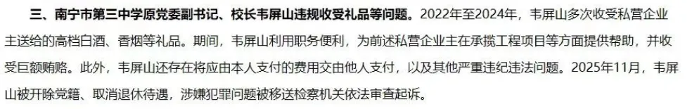 南宁市纪委监委的一纸通报,让无数南宁人的朋友圈炸了锅:南宁市第三中学原党委副书记、校长韦屏山,因严重违纪违法被开除党籍、取消退休待遇,并移送司法机关。