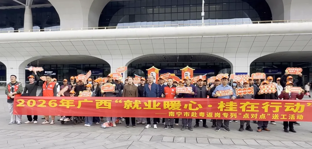 春潮涌动,复工正忙。2月24日上午,南宁籍务工人员搭乘2026年赴粤返岗复工专列奔赴广东,这趟专列是广西人社部门开展 “就业暖心桂在行动”专项服务活动的具体举措,全程免费、点对点直达,为务工人员返岗复工打通“快车道”,也为广东企业节后复产复工送上“及时雨”。