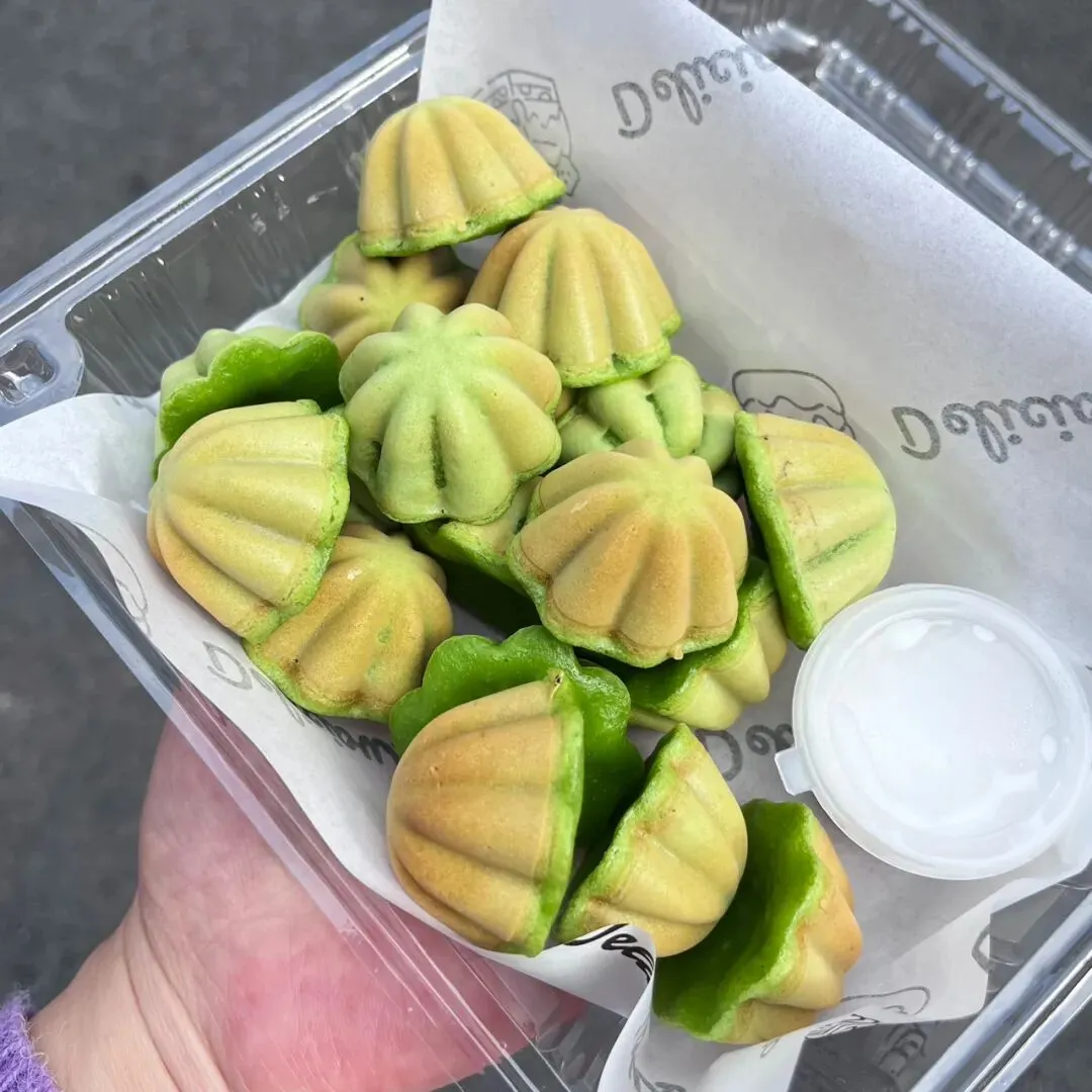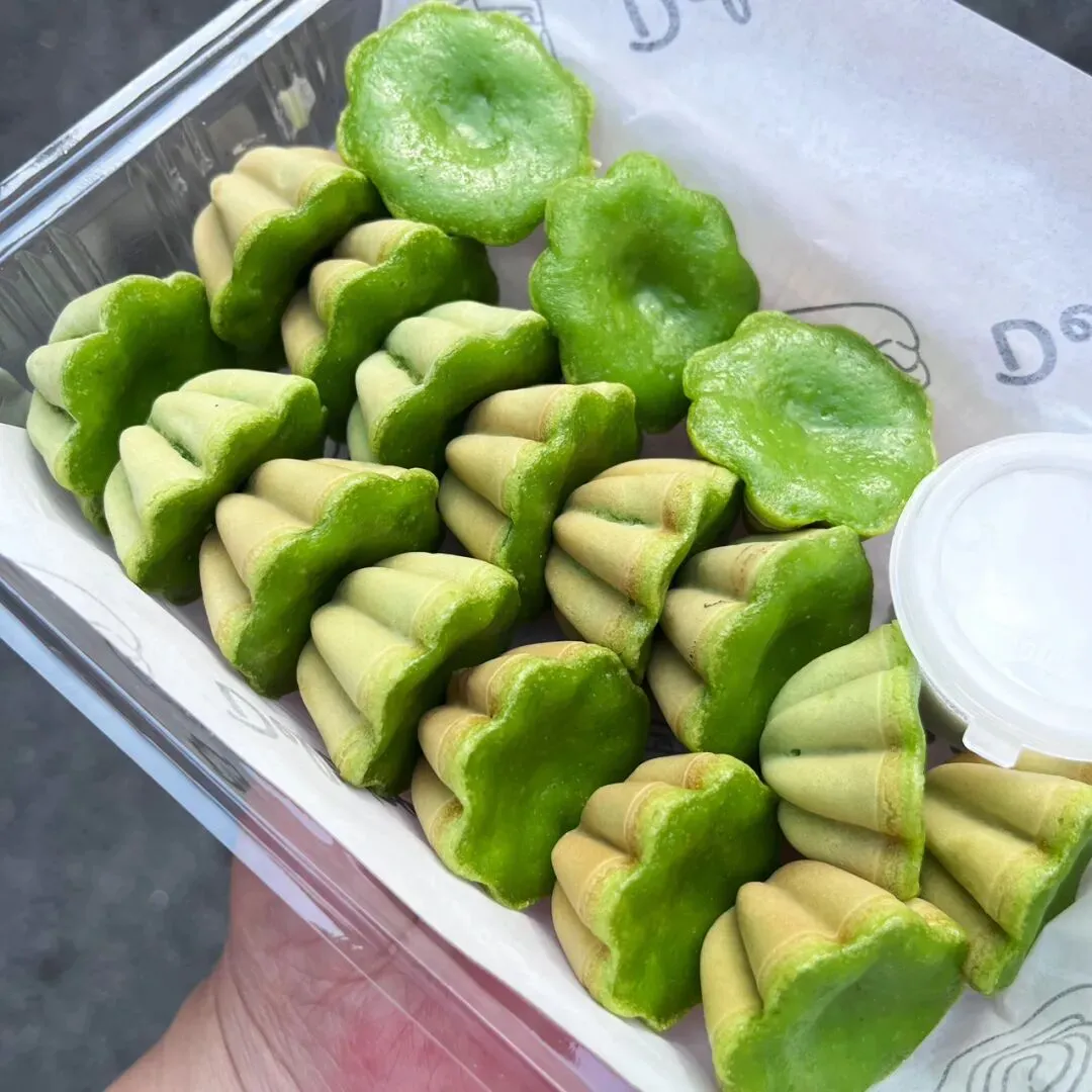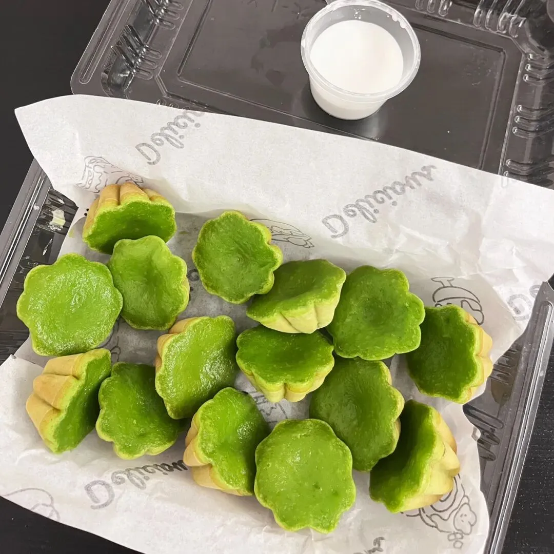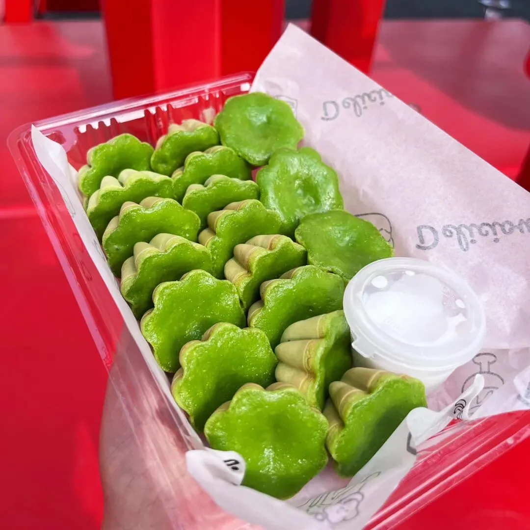 过年前,在新水街那边的邕州古城,发现了一家好吃的斑斓梅花小蛋糕。这梅花小蛋糕加了斑斓叶,有着独特的清香味,有点类似于粽香还有米香。很多东南亚的糕点都喜欢放斑斓叶,比如马来西亚的“娘惹”糕点,泰国的甜品等。斑斓叶除了特殊的香味,这清凉的绿色,在炎热的地区,也更好地增加食欲。斑斓叶除了增加糕点的特殊香气,给糕点有个漂亮的绿色之外,斑斓叶所含有角鲨烯有助于抗氧化,促进血液循环,所含的亚油酸有助于降低血脂,还含有丰富的维生素C、B族维生素,钾、镁等矿物质元素。这家店的斑斓梅花小蛋糕是现做现烤的,将斑斓叶汁调好的面糊,挤到烤小蛋糕的模具里,定时,烤好之后,用竹签挑出来。去到店里,看到都是有下单了,才开始烤,一炉一份,大概有18个左右。那天邕州古城水街人特别多,有很多去邕州古城水街拍古风的小女孩。这斑斓梅花小蛋糕从后面看,倒是像一个个绿色的莲蓬。个头不大,很精致,非常出片,和古风氛围还是挺搭的。去吃的那天,出大太阳,穿着毛衣非常热,看到这清凉的糕点,仿佛到了夏天。这斑斓梅花小蛋糕还配了一小盒椰浆,点着椰浆吃非常清爽。除了斑斓梅花小蛋糕,当天还点了一份可爱的“猫糕”,是一种椰子软糕,吃起来Q弹清爽,有着浓香的椰子味。“猫糕”小份的有4个,18块钱一份。口味可以自己选,当时选了椰丝、芒果、斑斓、芋泥这4种口味。这些糕点吃起来都不是很甜的那种,比较清爽,所以也不容易腻。这斑斓梅花小蛋糕,虽然说是梅花形状,但是背面看起来像莲蓬,翻到正面,又像一片片绿色的荷叶。这总是不由自主地让人想到夏天,然后在吃这些糕点的时候,不知怎么的,脑子里面老是在回荡加缪的“在隆冬,我终于明白,我身上有个不可战胜的夏天”这句话。之前主要是被斑斓梅花小蛋糕和“猫糕”所吸引,就直接奔这两种去了。去到店里,发现还有很多好看,看起来也好吃的其他糕点。这些看起来都挺清凉的,南宁的夏天那么漫长,看来这个夏天是有口福了。斑斓梅花小蛋糕也是18块钱一份,不过那天去的时候刚开业不久,有活动,是12块钱一份。这家店就在邕州古城水街大门旁边,进到大门就看见了,叫“桂胜园糕饼”。