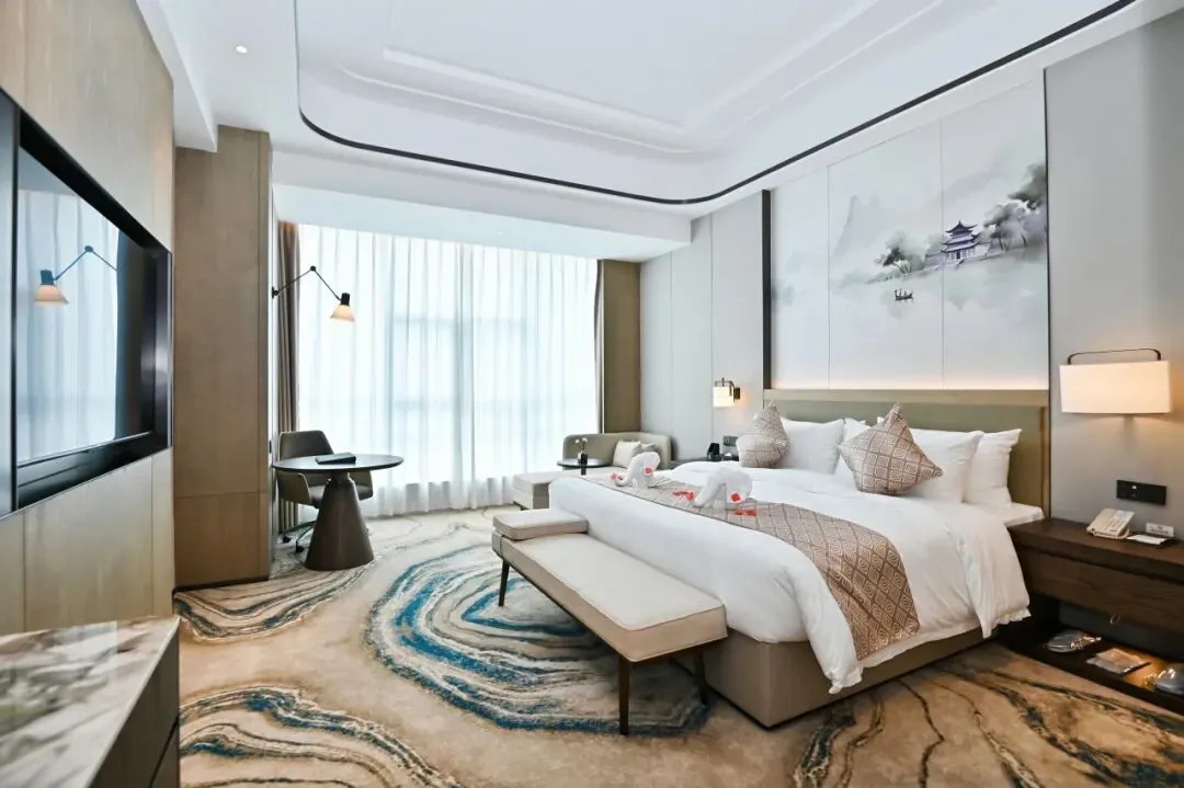 作为一体型星级酒店,参会者步行即可实现办公、洽谈、休憩的无缝切换。典雅温馨的客房配备智能设施,部分房型自带弧形大飘窗与浴缸,让外地参会客户或加班筹备的同事,都能享受舒适休憩体验;餐饮团队深耕匠心,融合广式风味与本地特色,可定制开门红主题宴席、精致茶歇,从早茶到晚宴,每一道菜品都承载着新春祝福,既满足味蕾需求,又彰显企业待客格调,让参会者在味蕾间感受新春暖意与企业关怀。