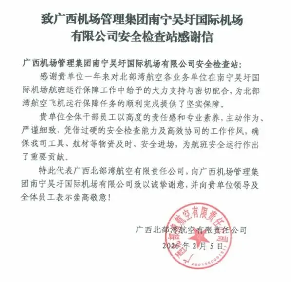 近日,北部湾航空公司向南宁机场安全检查站发来感谢信,对南宁机场安全检查站全年的工作支持与密切配合表示肯定和感谢。一直以来,南宁机场安全检查站始终秉持 “安全第一、真情服务”的宗旨。从工具、航材安全进场,到人员车辆高效通行以及保障信息的精准传递,安全检查站不断优化工作流程,提升服务品质,确保航班保障工作高效紧密进行,赢得了航司的一致好评。南宁机场安全检查站将持续深化与航司沟通协作,不断锤炼专业能力,提升服务品质,以“时时放心不下”的责任感守牢安全底线,为航司与旅客提供更优质、更高效的服务。(通讯员:南宁机场,周亚丽)