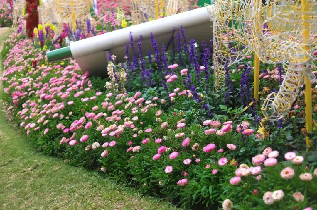 清新的蓝色与粉色的麦秆菊形成鲜明的色彩碰撞,为冬日的公园增添了一抹灵动。