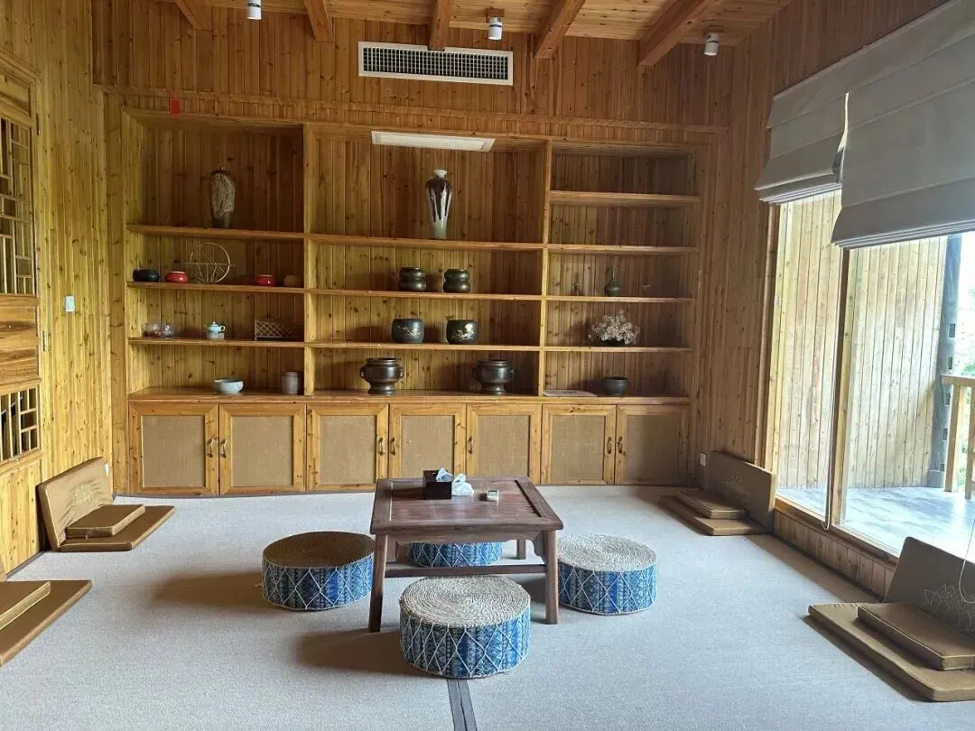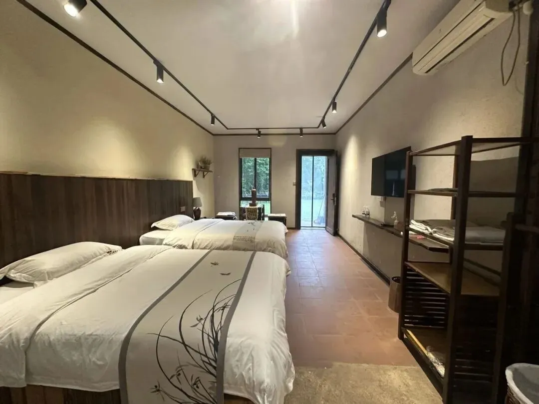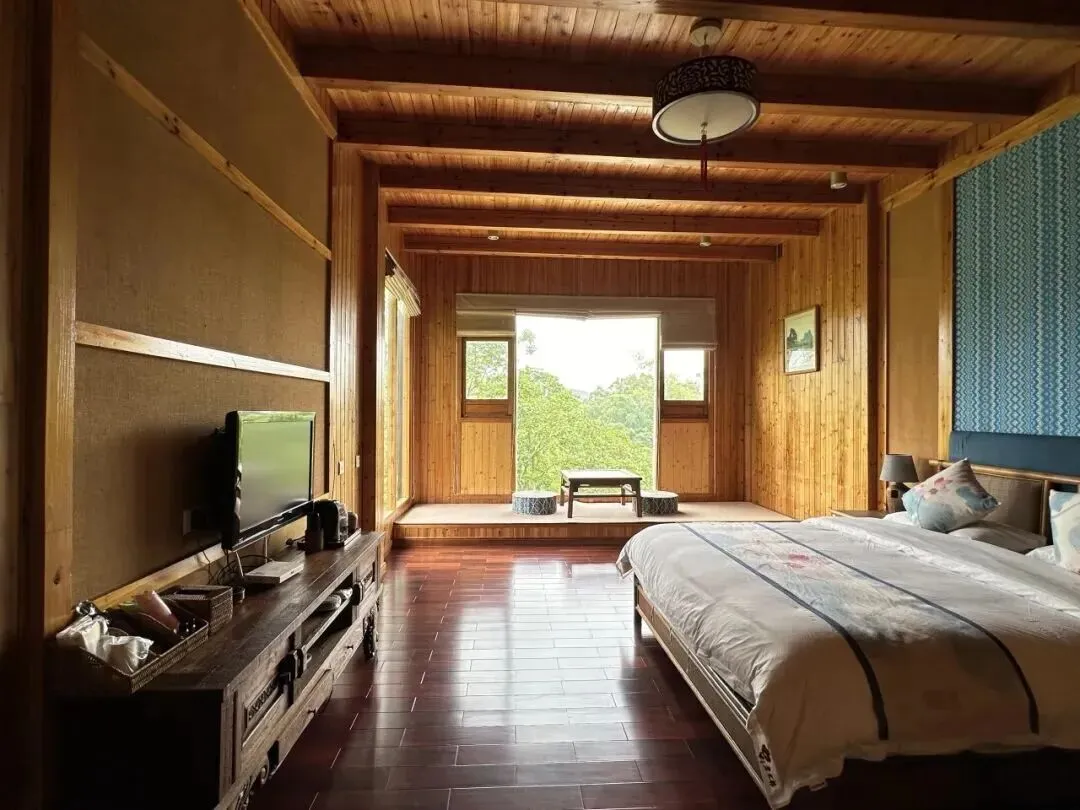 房间或是竹林木屋,自带超大落地窗,清晨推窗,满目山色奔来眼底;有的隐于林深处,晴天可观日,雨天可听风。