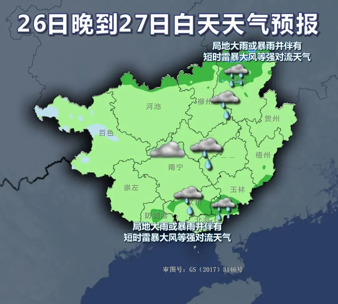 预计今天(25日)晚上到明天(26日)白天,桂林、柳州、贺州、来宾等市阴天有小到中雨、局地大雨或暴雨,其他地区阴天到多云有小雨、局地中雨;桂北局地伴有短时雷暴大风、冰雹等强对流天气。