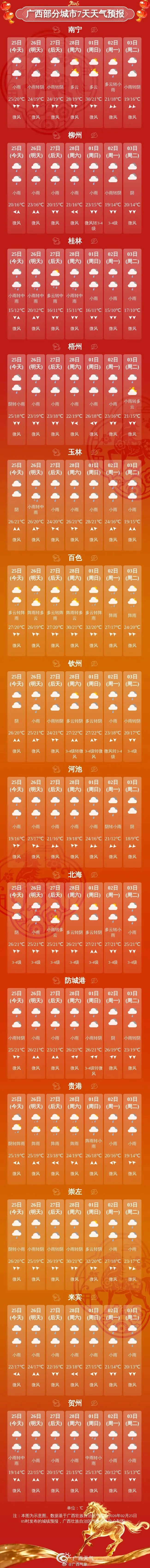 27日最高气温:桂东北15℃~19℃,其余地区20℃~25℃,桂西部分地区26~28℃。
