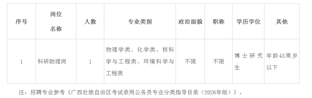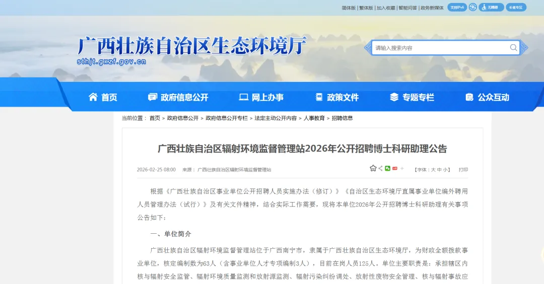 岗位1:广西壮族自治区辐射环境监督管理站2026年公开招聘博士科研助理公告http://sthjt.gxzf.gov.cn/zfxxgk/zfxxgkgl/fdzdgknr/rsgl/zkxx/t27281123.shtml
