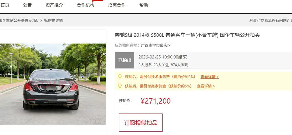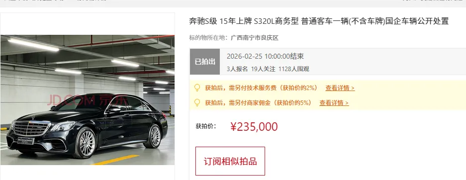 2月25日,在京东拍卖上,一辆现在停放在南宁市的奔驰S级豪车被拍卖,这是一辆2014款 奔驰S500L,2014年1月份初次登记的,已经有12年车龄了,车龄比较老了,不过从图片来看,保养还可以,然后车辆行驶里程为17.5万公里了,行驶里程也是非常大。拍卖公告说,该车没有发生重大事故,非泡水车,也没有抵押,没有违章未处理的。拍卖的起拍价为13.8万元,拍卖开始后,吸引了3个人各缴纳了8000元保证金报名竞拍,竞拍每次最低加价幅度只有300元。但是拍卖过程,竞拍者加价就非常猛,第一个竞拍者第一次出价就直接加价到16.83万元,根本不是以起拍价出价竞拍的。最终,整个拍卖过程只出现了7次加价就结束拍卖,然后成交价来到了27.12万元,成交价比起拍价高出了13.32万元。这辆奔驰S级豪车拍卖,应该说整个拍过程的加价竞拍出乎很多人的意料,感觉一次加价几万元不是钱而已。而要注意的是,此次拍卖的这辆奔驰车,并不是法拍车,只是一起商业拍卖而已,并不是法院拍卖的,而是一家公司拍卖的。对于这种商业拍卖来说,如果对于普通竞拍者来说,想捡漏的可能性非常低。这种商业拍卖,一般都有托参与竞拍的,不可能以低价就成交了。此前该公司也拍卖过一辆豪车,结果拍卖有人出价竞拍了,结束的时候拍卖还是失败了,原因是最终的价格没有达到所谓的保留底价,但是拍卖公告却没有说明拍卖设有保留底价,而且具体的保留底价是多少,无人得知。而值得注意的是,也是同一天,南宁另外一辆15年上牌的奔驰 S320L也是被拍卖,也是同一家公司拍卖的,起拍价12.5万元,也是3个人报名竞拍,结果只出价了5次就以23.5万元高价成交了。所以,通过这样的车辆拍卖,对于那种想通过网上拍卖平台竞拍二手车的,在参加竞拍的时候,要看一下是法拍车还是普通商业拍卖,两种拍卖性质是不一样的。在拍卖平台,甚至有些资产拍卖,是打着公司破产资产处置拍卖的,但实际上还是商业拍卖。一般能有机会捡漏的,只有法拍资产。