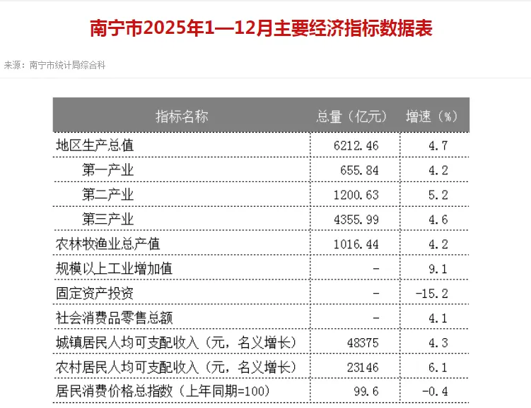 2025年1-12月,南宁全市经济稳中有进、稳中向好,生产供给稳定增长,市场需求持续提振,外贸进出口态势良好,民生保障扎实有力,新质生产力培育壮大,高质量发展取得积极成效。