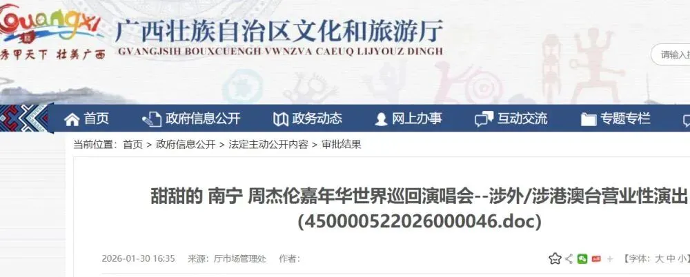 根据广西壮族自治区文化和旅游厅2026年1月30日发布的《甜甜的 南宁 周杰伦嘉年华世界巡回演唱会--涉外/涉港澳台营业性演出(450000522026000046.doc)》: