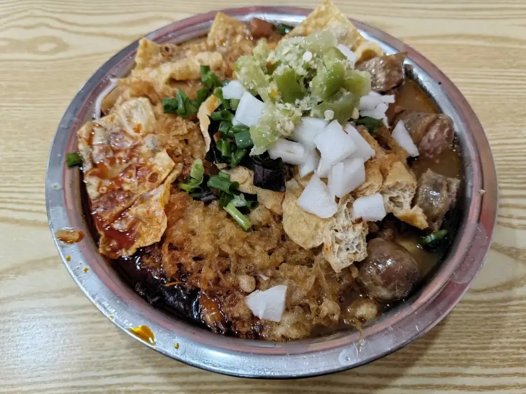 生榨米粉似乎更符合这一特点。听说传统的生榨米粉要经些发酵工艺,带酸口,但是现在基本省了这道工序。听他人描述,其做法似乎类似于北方的饸络面,经厚米浆榨制成粉,煮熟后佐以肉末、煮至软烂的牛腩、鹌鹑蛋卤鸡蛋等添头,加焯烫完毕的生菜,和一勺炸的稀酥蹦脆的花生米。食用时,要在盆儿里加一大勺紫苏、一大勺酸菜、一小勺蒜末,还有柠檬酸酱、不知名的辣酱等用于锦上添花,接着打开高汤大桶上的水龙头,让清澈而滚烫的高汤淹死铁盆中的一切食材:不会游泳的粉在下面咕噜咕噜,会游泳的肉沫、小葱和紫苏碎叶子浮上来。但是没关系,他们殊途同归,都是被尼斯湖水怪的血盆大口吞噬。