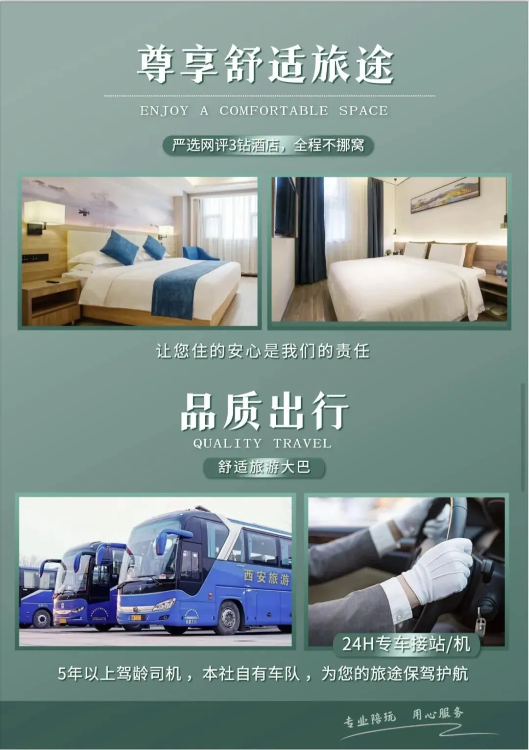 全程尊享舒适旅途,严选西安网评 3 钻酒店,4 晚全程不挪窝,住得安心又舒心;配备本社自有车队,5 年以上驾龄司机保驾护航,全程舒适旅游大巴,还有 24H 专车接站接机服务,专业陪玩用心服务。行程中还贴心赠送汉服换装体验,穿一身唐装漫步大唐不夜城,沉浸式赴一场大唐之约,更有民国换装秀,穿越百年关中感受白鹿原风情。