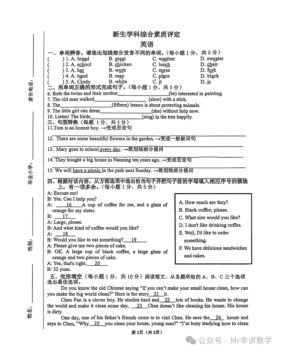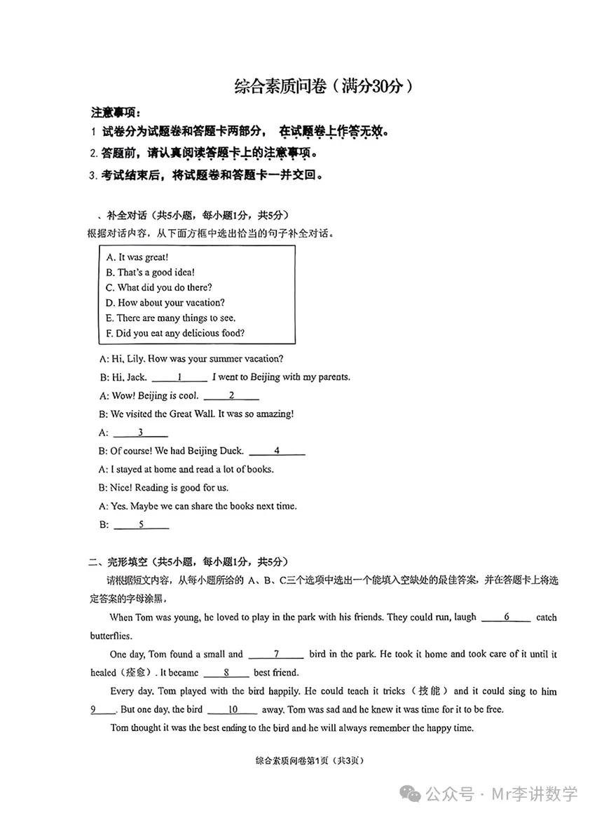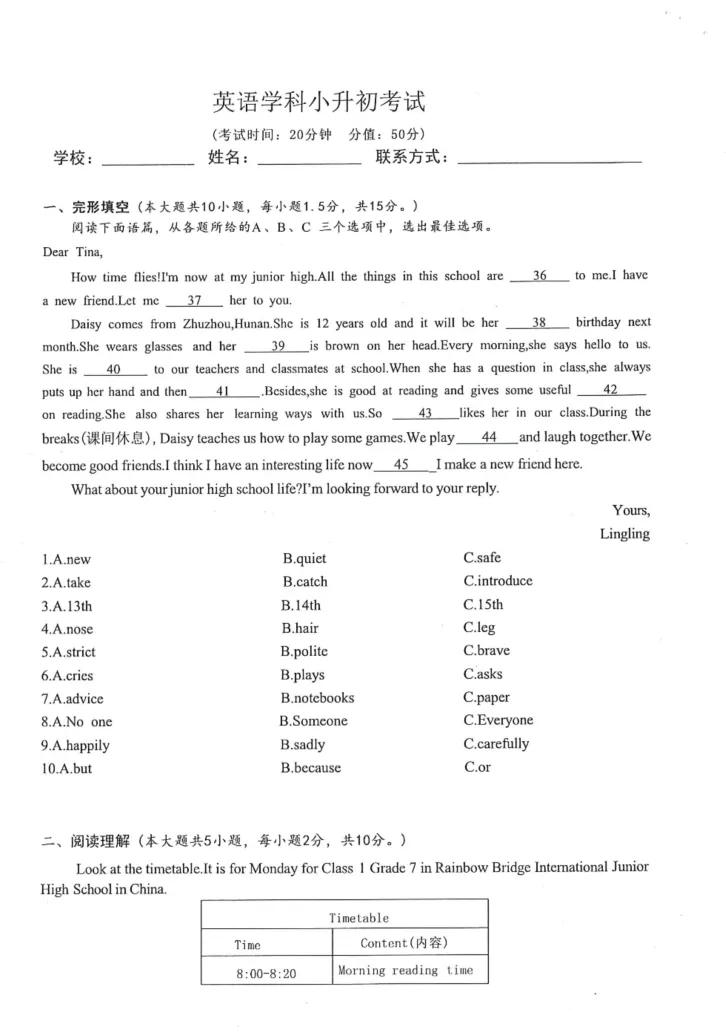 语数英三卷合一,其中数学颇难,涉及到初中知识点以及奥数;英语不仅考单词,还考其灵活运用。