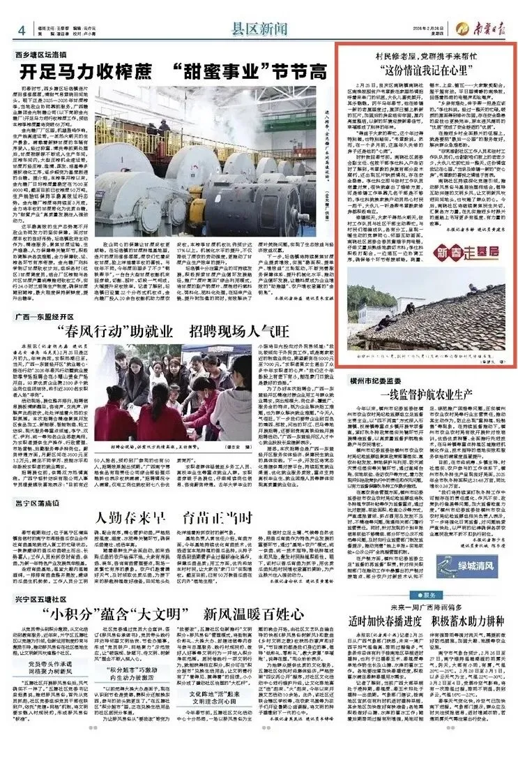 2月25日,良庆区南晓镇南晓社区南焕坡脱贫户韦章毅在家里热情招呼着来串门的邻居,大伙儿喜笑颜开,其乐融融。丙午马年春节,他在修缮一新的老屋里度过,屋顶已铺上崭新的瓦片,加固后的房梁结实牢固,屋内亮堂整洁,以新的环境迎接新春佳节,幸福感成了别样的年味。