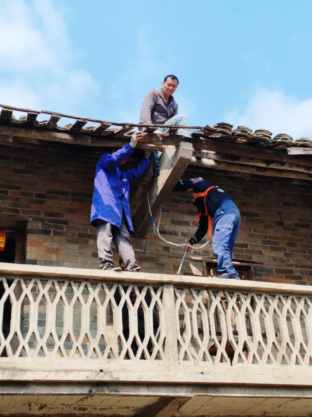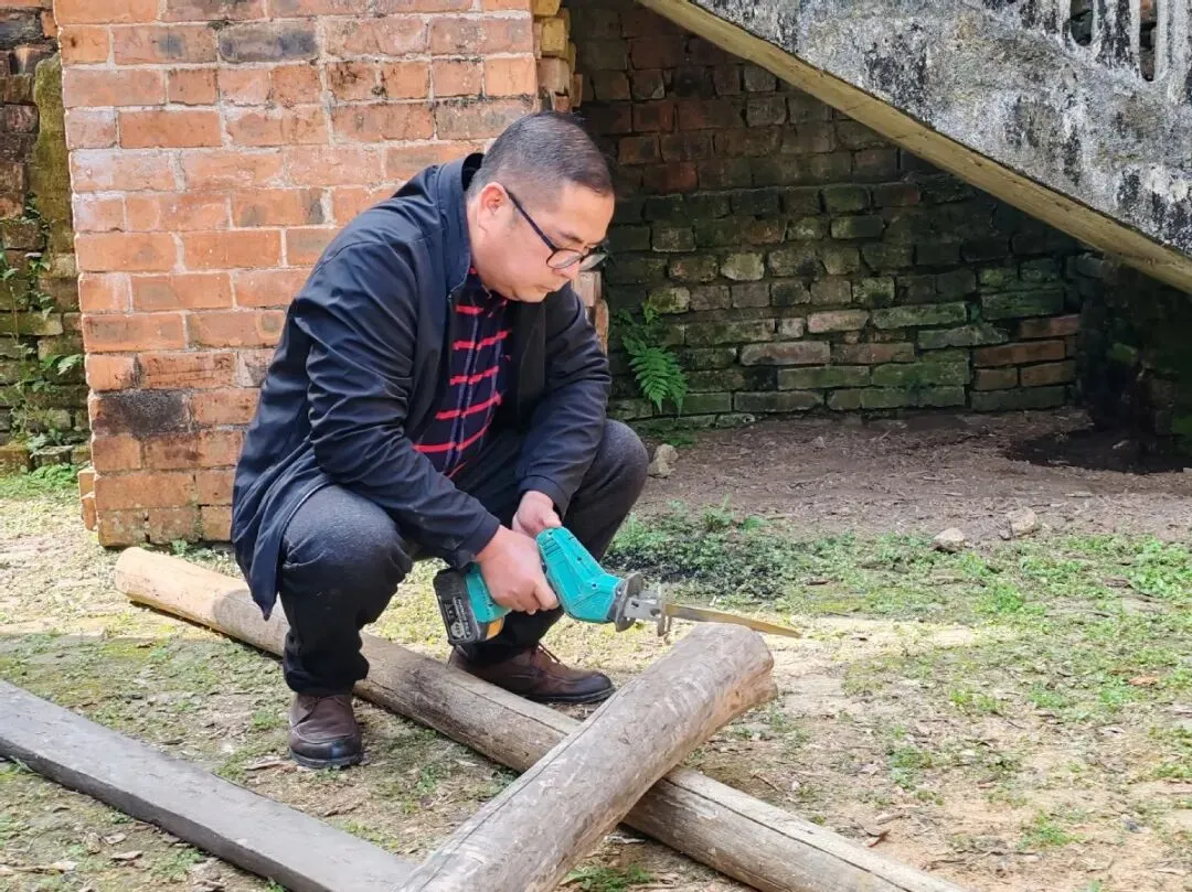 修缮那天,大家干得热火朝天,驻村工作队员与社区干部主动帮忙,与村民们混编成队,各有分工,呈现一幅生动的党群同心、邻里互助画面。南晓社区居委会委员詹维手持电锯,仔细丈量后熟练地裁切木料;李仕科积极打配合,一边递瓦一边协调工序,确保每个环节衔接顺畅。测量、锯木、上梁、铺瓦……大家默契配合,越干越有劲。平日里清静的南焕坡,回荡着热闹的电锯声和吆喝声。