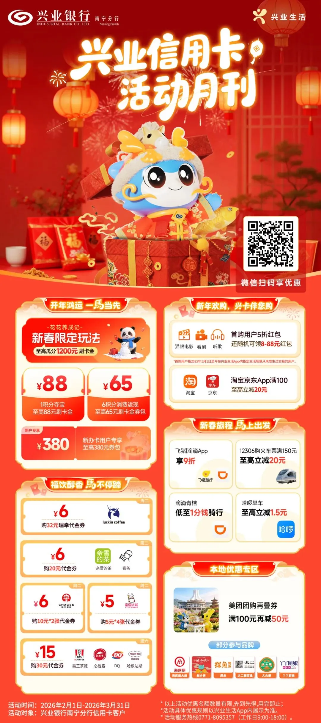 近日,兴业银行南宁分行积极响应商务部等9单位联合印发的《2026“乐购新春”春节特别活动方案》,围绕“吃住行、游购娱”全链条,打造“金融+场景”服务模式,推出立减、返现、积分兑换等多项活动,助力当地旅游与周边消费的协同增长,点燃假日经济新活力。