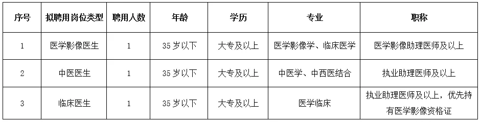 根据医院业务发展需求,现向社会公开招聘以下岗位人员,具体招聘事宜如下: