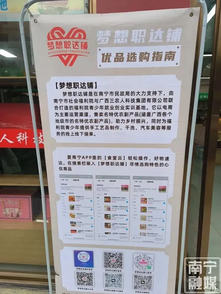 2025年3月12日,“梦想职达铺”正式运营。店内不仅陈列着上百种广西各地的农特产品,还展销与义卖特殊青少年制作的手工文创作品。此外,店铺还承接特定家政服务,满足多样化的市场需求。市民既可以到店选购,也能通过抖音直播、“爱南宁”App食堂云板块下单,用实际行动支持特殊青少年的就业创业梦想。