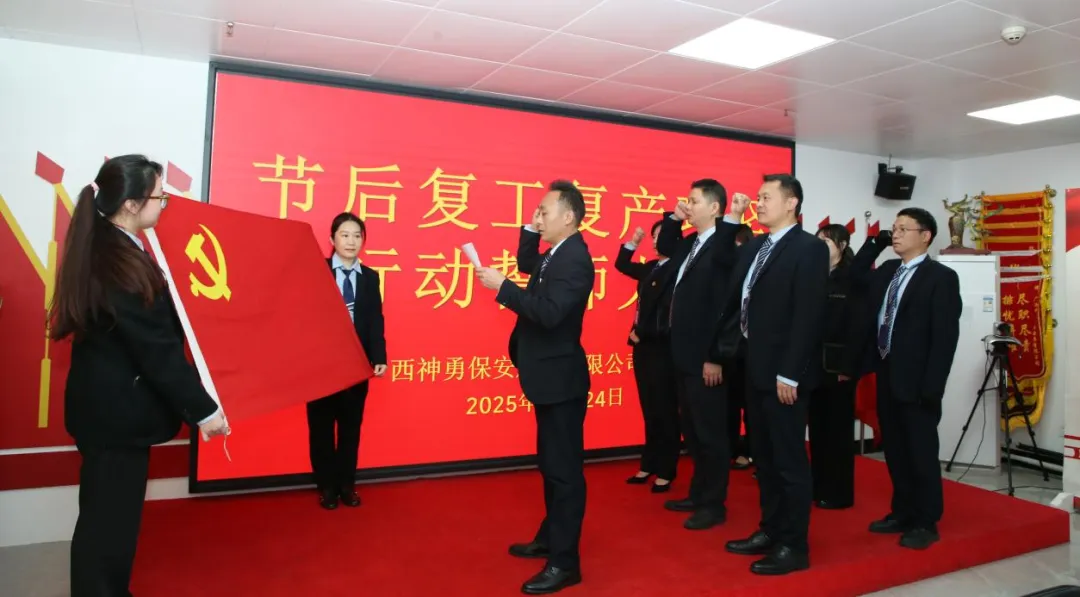 广西神勇保安服务有限公司党支部率先组织思想作风、安全规范学习,全体党员重温入党誓词,立足安保岗位谈担当、话落实,进一步强化宗旨意识和责任观念;广西靖天保安服务有限责任公司党支部开展“党建领航・平安复工”主题党日,以安全生产为核心,党员带队开展重点部位全覆盖安全排查;神之盾保安集团有限公司广西分公司党支部以开工第一课赋能思想,推动党员职工快速从假期模式切换至工作状态;广西强兵保安服务有限公司党支部召开复工专题部署会议,明确全年安保服务重点工作;广西国之泰保安服务有限公司党支部将开工第一课纳入复工整体部署,同步做好政策解读与任务落实;广西安泰特保保安服务有限公司党支部把开工第一课与主题党日结合,聚焦安全生产、规范执勤开展学习;广西百全保安服务有限公司党支部在开工第一课中剖析安全案例,牢固树立全员安全责任理念;陕西京泰源保安服务有限公司广西分公司党支部开展开工第一课,重温党的二十大精神,强调复工后岗位职责与服务标准。