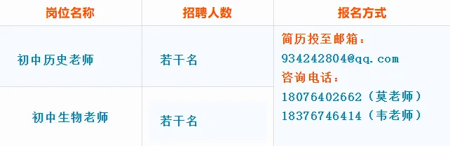 初中教师:本科及以上学历,具有相应的教师资格证、普通话等级证,年龄40周岁以下,有教学经验者优先考虑。
