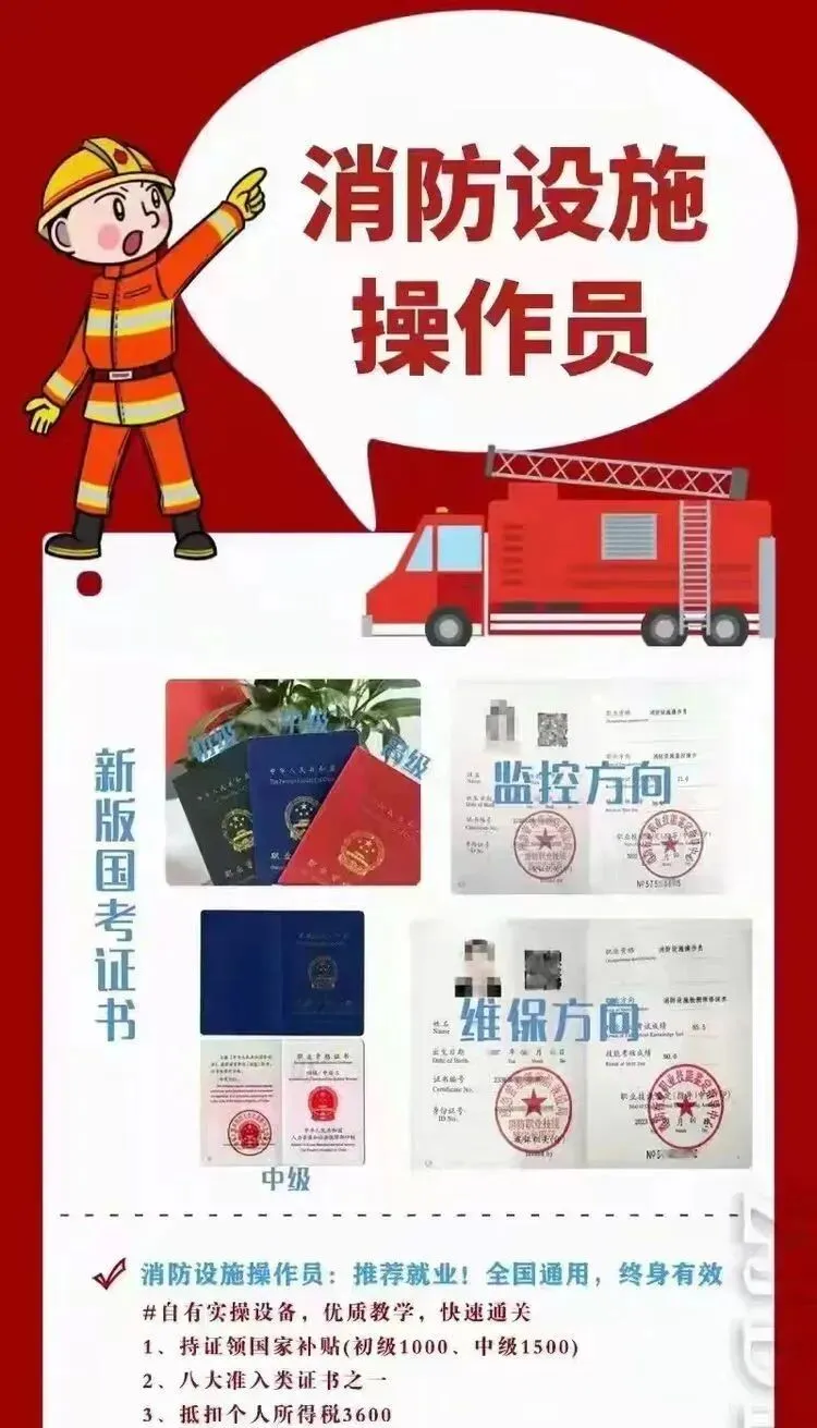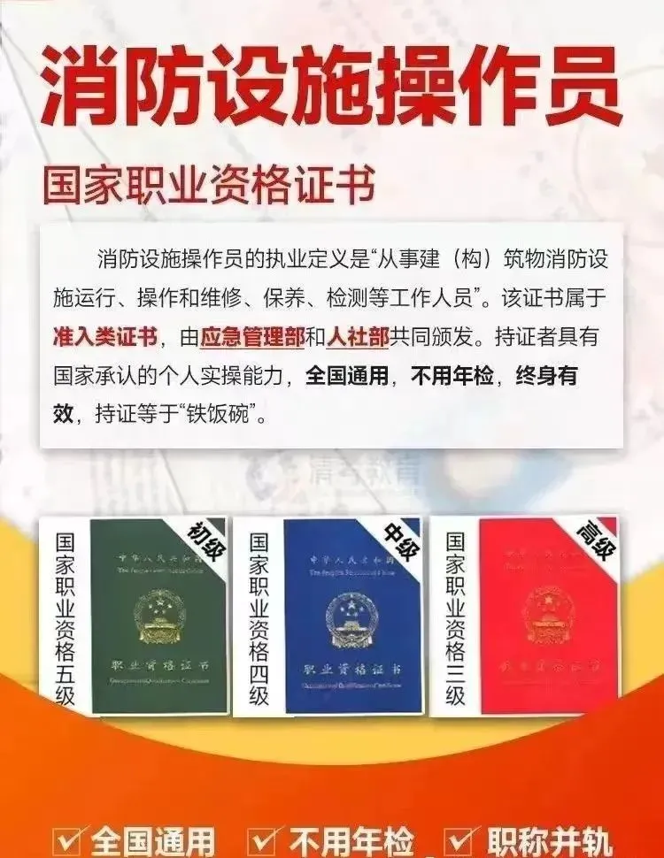 行业刚需:消防设施操作员证书为准入类技能职业资格第一序列,是上岗必备证书。