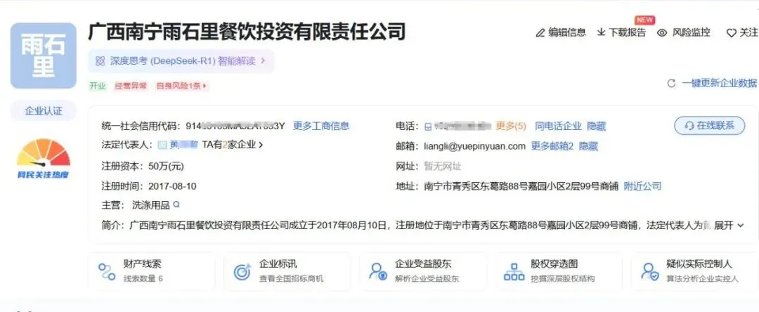 不过在爱企查显示,南宁市雨石阁饮食有限责任公司已于2021年注销,而广西南宁雨石里餐饮投资有限责任公司显示开业状态。