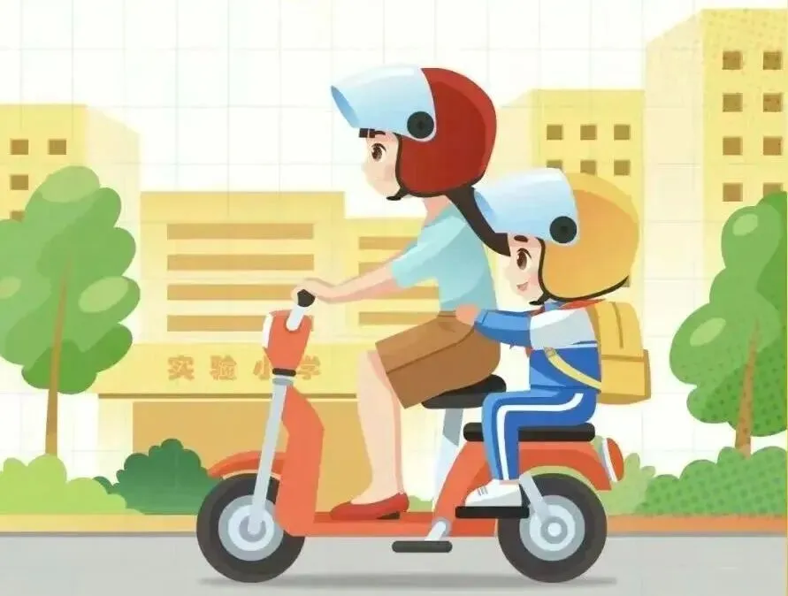 8. 骑电动自行车接送孩子时,务必与孩子共同佩戴安全头盔;教育孩子乘坐公共交通时排队上下车、坐稳扶牢,不将头、手伸出窗外;乘坐校车必须系好安全带,低年级学生须由家长接领方可下车。