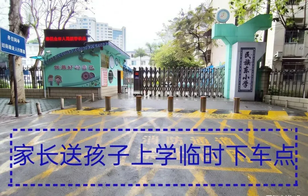 家长接送孩子禁止将汽车驶入临时下车点(图示蓝框区域),请在图示的黄色区域内靠边停车,电单车可在临时下车点临时停靠。禁止将电单车停放在家长等候区处。在校门对面停车下来的孩子,统一听从安全协管员的哨声提示,步行经过斑马线走进校园。请积极配合学校老师和家长志愿者的引导和协调,在校门口等候孩子时,禁止吸烟、乱丢杂物,接到孩子立即离开,不要在校门口滞留。