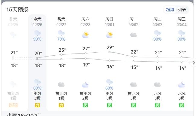 南宁市气象台预计,25日白天,南宁城区阴天转小雨,东南风2级,最低气温19℃,最高气温25℃。