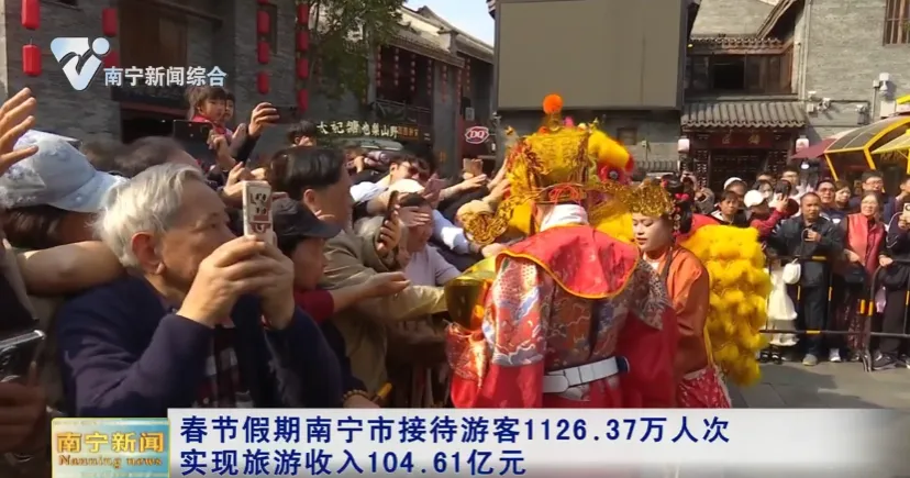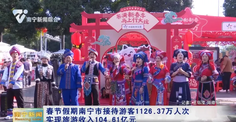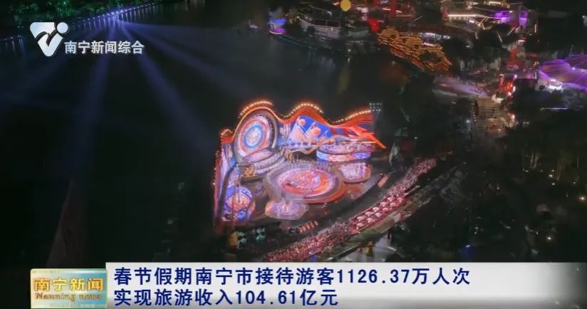 根据广西旅游抽样调查统计测算,2026年春节假期(2月15日至23日),南宁市共接待游客1126.37万人次,同比增长16.4%;实现旅游收入104.61亿元,同比增长18.4%,均创下历史同期最高纪录。