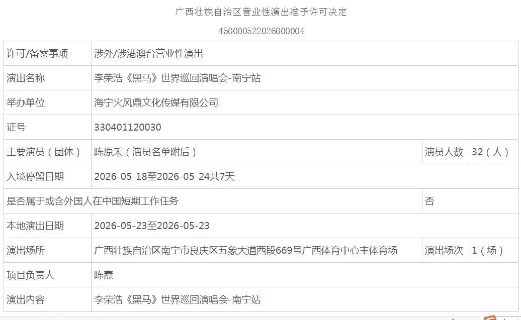 🎶 5月下旬:李荣浩「黑马」巡演南宁
