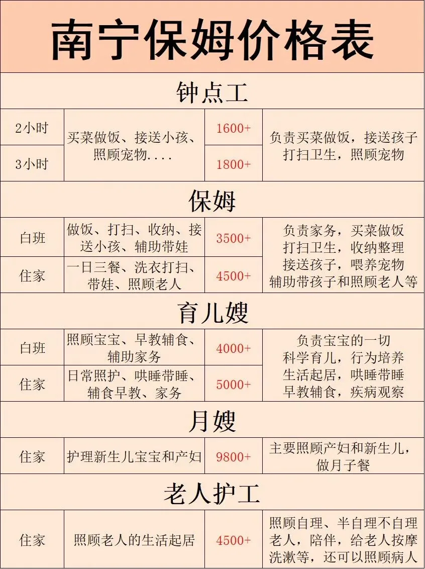 南宁请保姆阿姨一般多少钱一个月? 其实,地区差异、对阿姨的要求不同、工作内容不一样等因素,都会导致保姆阿姨工资有所差别。 下面为大家详细呈现南宁保姆的价格情况,助你在找保姆时明明白白消费,轻松挑选到心仪且价格合理的保姆阿姨!