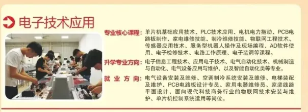 专业核心课程:单片机技术应用、PLC技术应用、电工基础、电路原理、电子技能、电机电力拖动、电气制图与识图、服务型机器人现场编程、传感器技术应用本专业注重理论与实践相结合,建有现代化的电子技术应用实训室,配备先进的实验设备和教学软件。通过项目式教学、校企合作、技能竞赛等多种形式,让学生在真实或模拟的工作环境中进行技能训练,提升解决实际问题的能力。