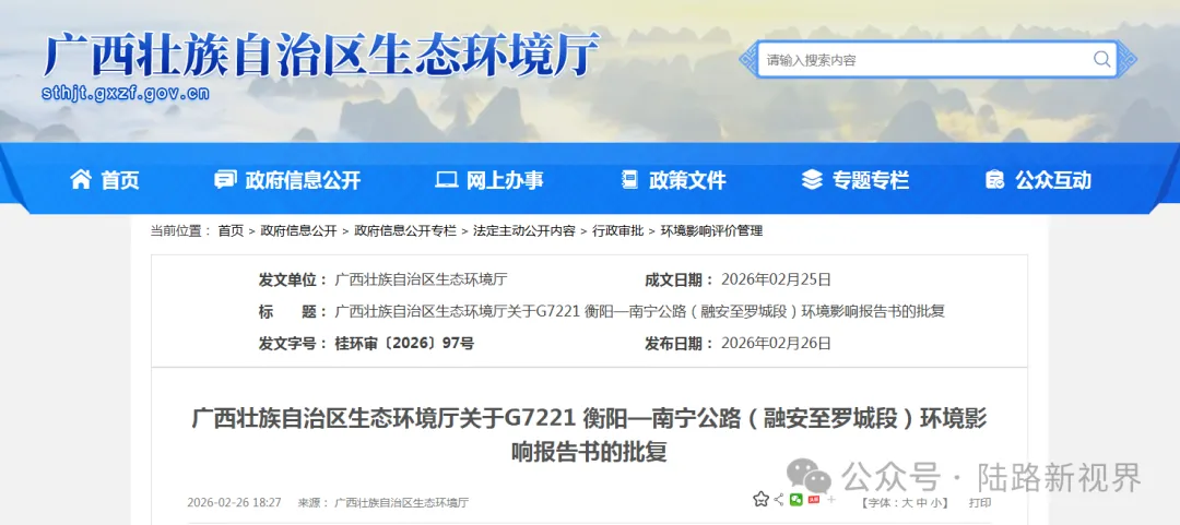 2026年2月25日,广西壮族自治区生态环境厅正式批复《G7221衡阳—南宁公路(融安至罗城段)环境影响报告书》,并于次日(2月26日)通过官方网站向社会公布批复内容。这一里程碑事件标志着这条连接桂北与桂中地区的重要交通动脉进入全面建设阶段,也为广西高速公路网“纵8线”的完善注入强劲动力。