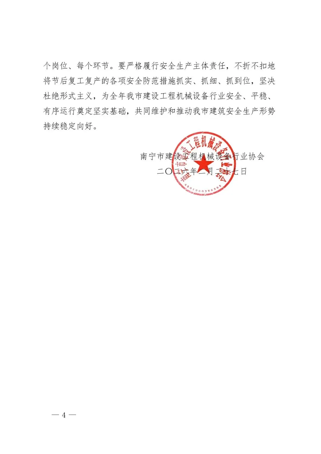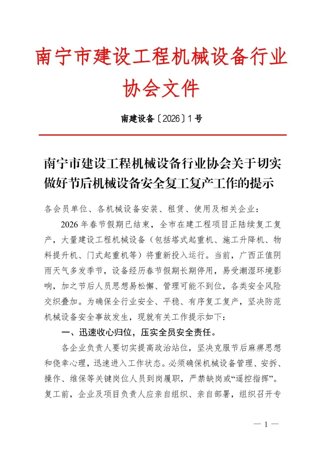 >南宁市建设工程机械设备行业协会关于切实做好节后机械设备安全复工复产工作的提示