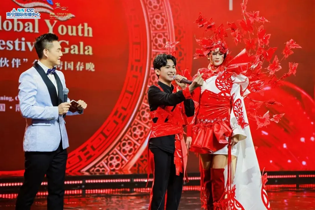 在南宁主会场,我校影视与传媒学院人物造型专业印度尼西亚籍学生斐优术(师从黄焱冰副教授)用巧思与匠心,设计制作了新春主题系列服装。他将中国传统剪纸艺术与印尼传统纹样巧妙融合,其中一件作品更由中国著名模特陆仙人倾情演绎——融合剪纸元素与火凤凰造型的中国红服饰,在舞台上绽放出喜庆灿烂的节日光彩,引得全场目光聚焦。更令人惊喜的是,斐优术不仅以设计“说话”,还身着红色印尼服饰,与中国、老挝的青年歌手同台合唱《青春正Young》,从幕后走到台前,展现了我校学子的综合实力。一曲唱罢,他接受了央视CGTN著名主持人王冠的专访,分享了自己在中国留学的动人故事,让更多人听到了这个来自印尼的青年与中国结缘的故事。