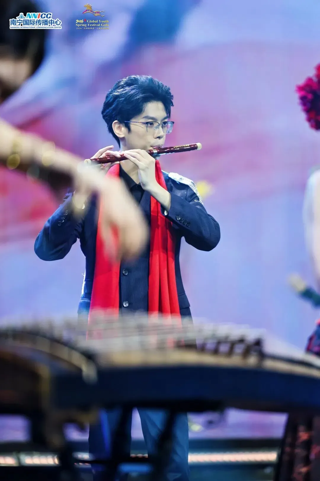 同一舞台上,我校艺术研究院马来西亚学生和泽森(师从楚卓副教授)以竹笛奏响《山海和鸣•万马奔腾》。他与广西民族乐团、翼境枫尚艺术团联袂献艺,在《赛马》的经典旋律中,中外青年乐手以笛声勾勒出草原的辽阔意象,器乐与舞蹈相映成趣,赢得阵阵掌声。