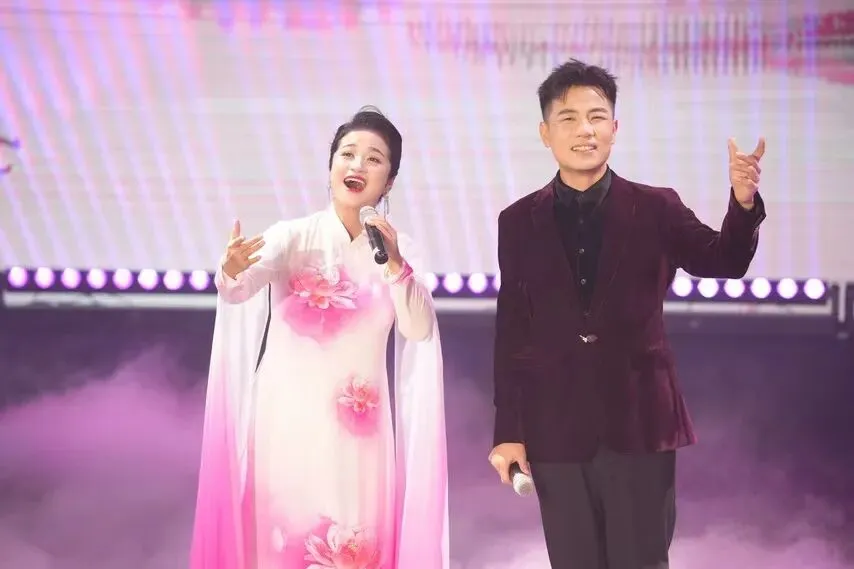 越南校友杜氏清花与中国歌手刘海旋在春晚越南分会场对唱歌曲《你来我往有情缘》