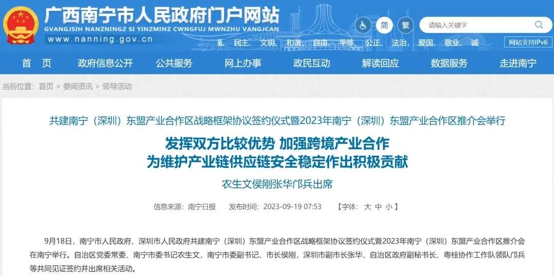 2023年9月,深圳、南宁两市政府签订《共建南宁(深圳)东盟产业合作区战略框架协议》,宣告了这一合作区的正式成立。