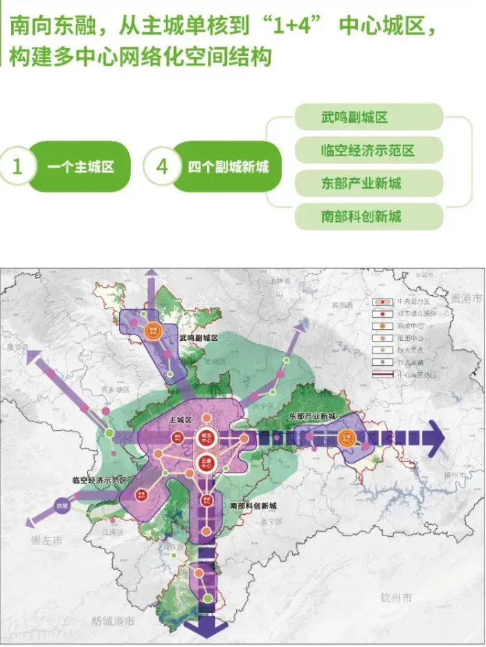 2021年,最新版本的《南宁国土空间总体规划2021-2035》公布,在这一版规划中,“四大城市副中心”的概念,被“一主四副城新城”新定位取代。