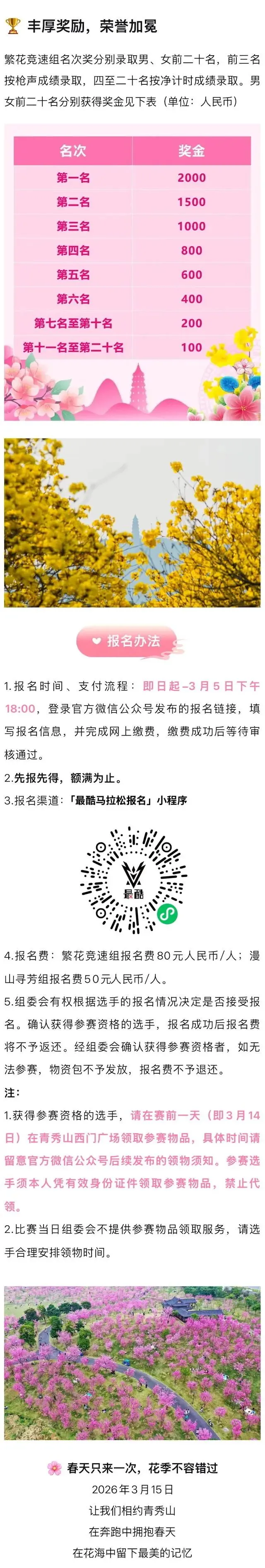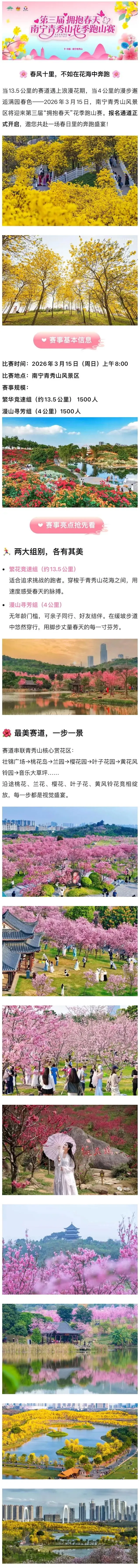 当13.5公里的赛道遇上浪漫花期,当4公里的漫步邂逅满园春色——2026年3月15日,南宁青秀山风景区将迎来第三届“拥抱春天”花季跑山赛,邀您共赴一场春日里的奔跑盛宴!