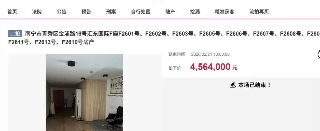 近日,在阿里拍卖上,南宁市迎来了一宗重量级的房产拍卖,一宗位于南宁市青秀区金浦路16号汇东国际F座F2601号、F2602号、F2603号、F2605号、F2606号、F2607号、F2608号、F2609号、F2611号、F2613号、F2610号房产被拍卖。此次拍卖的房产分成了11套,但是这11套房子相互打通了,总建筑面积为841.69平方米,规划用途为住宅,不过从图片来看,这些房产原来实际是用作办公用途之类的,现在已经空置,房子是两个人所有,其中一个人有10套,另外一个人有一套。
