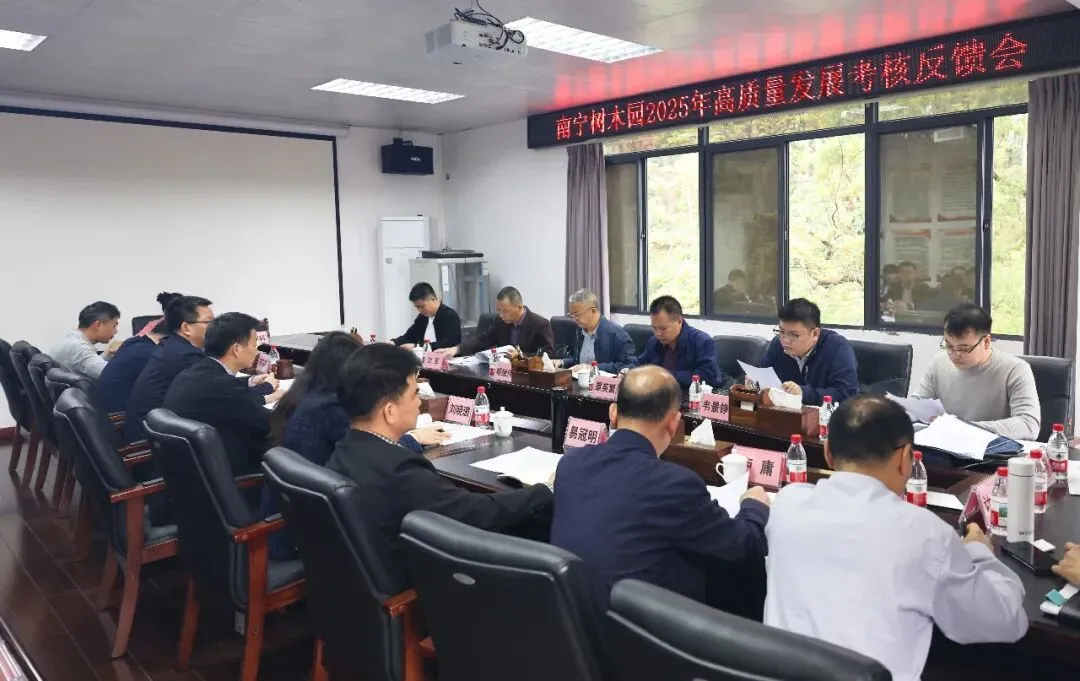 2026年2月27日,自治区林业局高质量发展综合考核第三组组长、离退处处长杨继伟带队到南宁树木园反馈2025年度高质量发展考核检查情况。南宁树木园主任余注光及领导班子成员、工会主席、相关业务部门负责人参加会议。