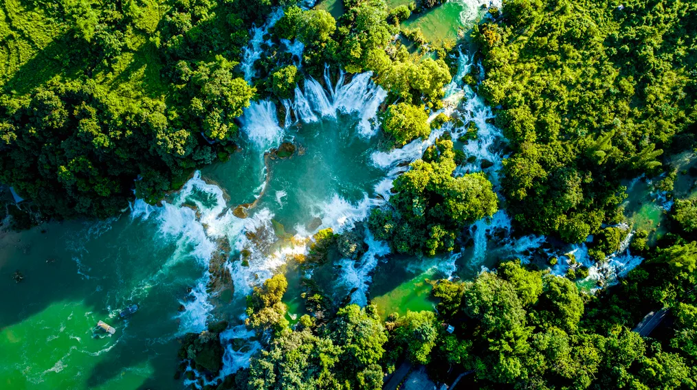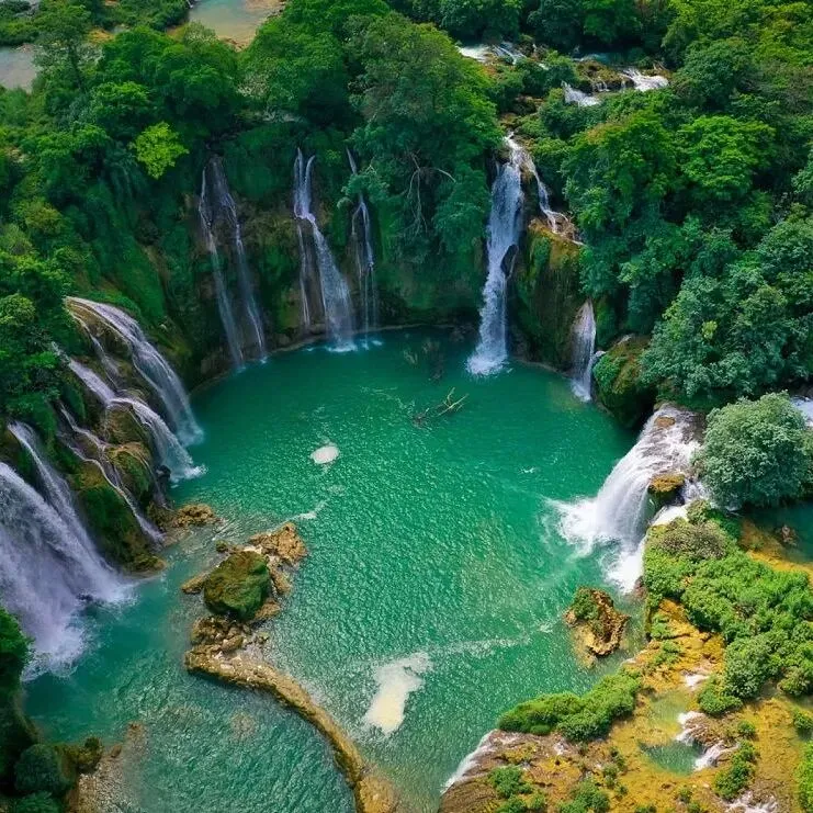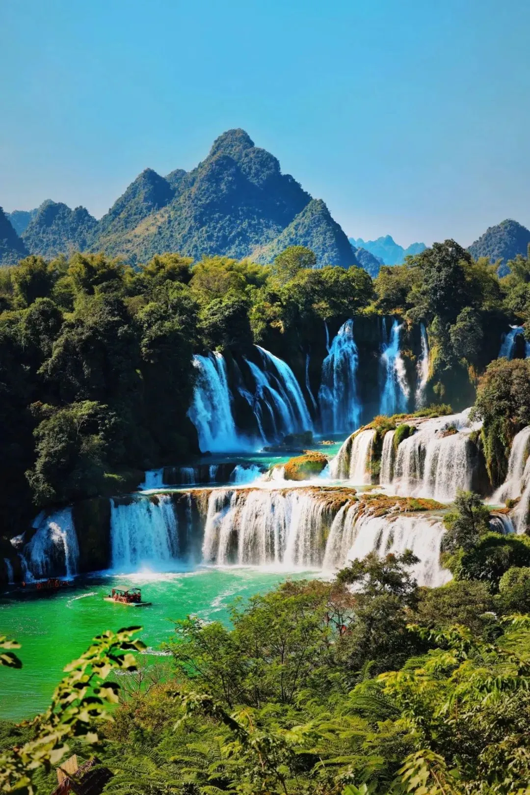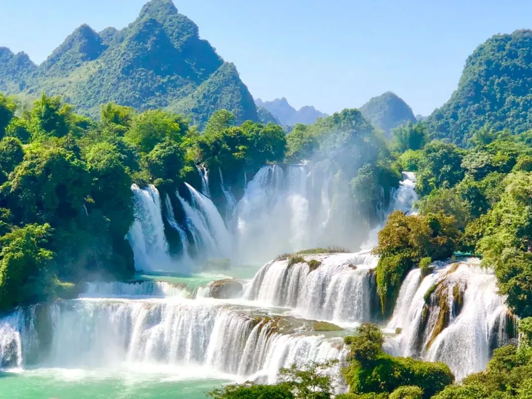 瀑布气势磅礴、蔚为壮观,与紧邻的越南板约瀑布相连,