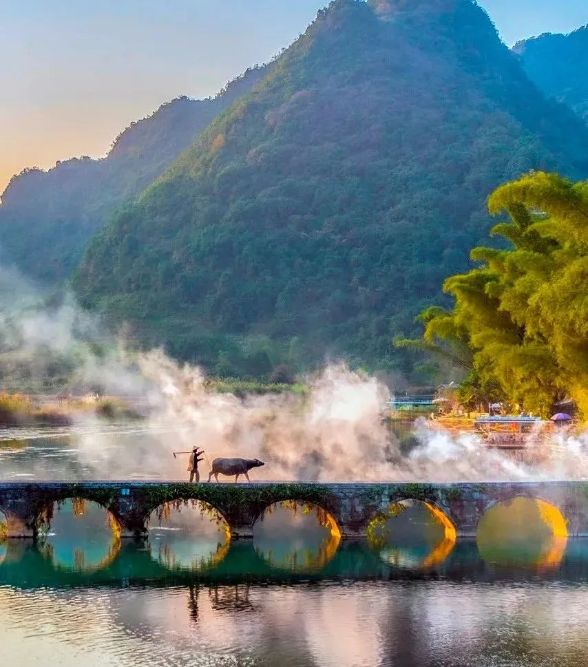 辛勤劳作一天的牛群,走在洒满光晕的石桥上,
